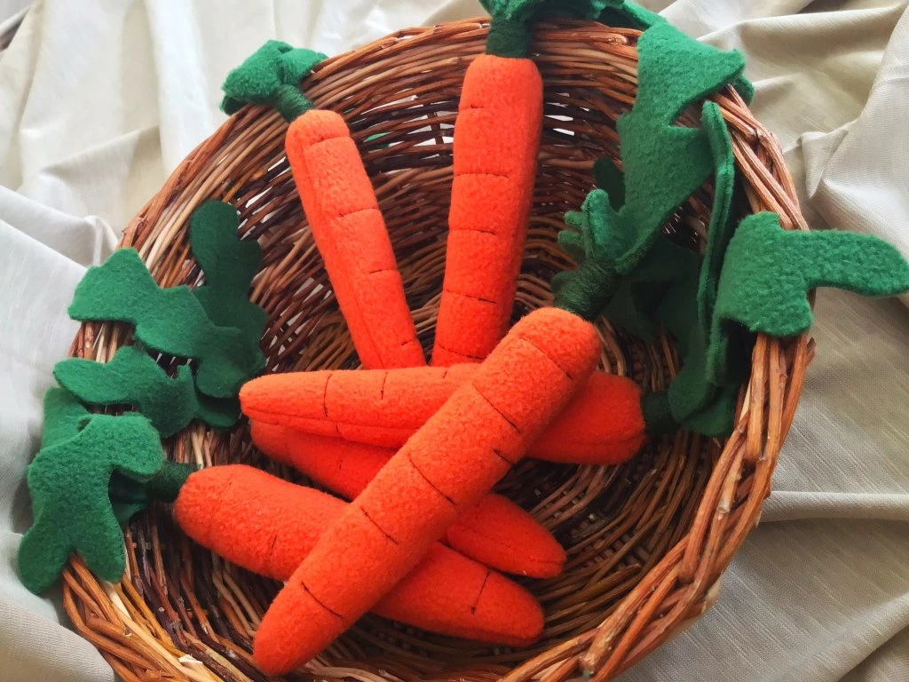 mrkvičky (2ks) v jutovom vrecúšku: hlavý materiál: fleece (polyester), výplň: antialergické duté vlákno (polyester), vrecko: textil (jutovina, polyester)